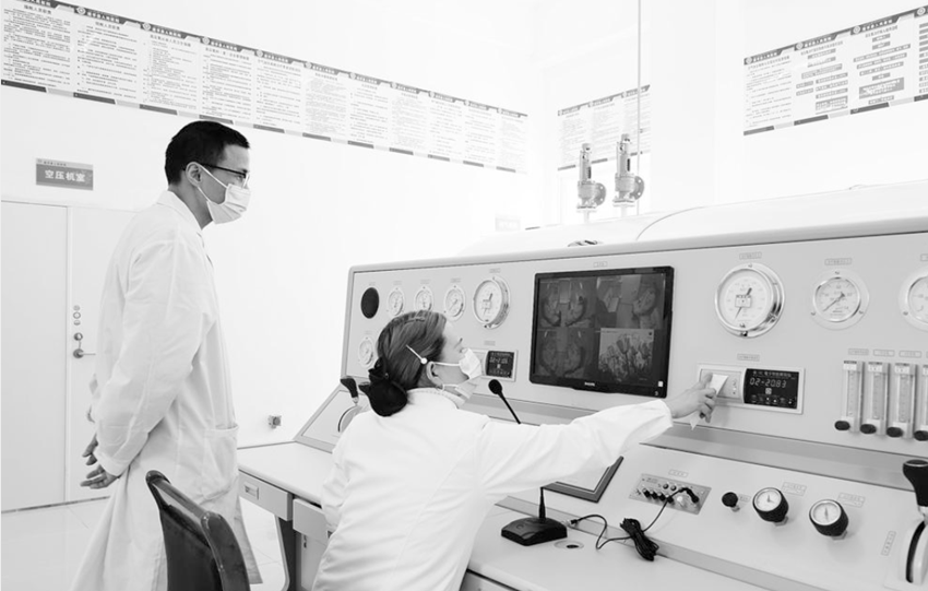 醫(yī)護人員在操控設(shè)備,同時全程密切關(guān)注艙內(nèi)情況。