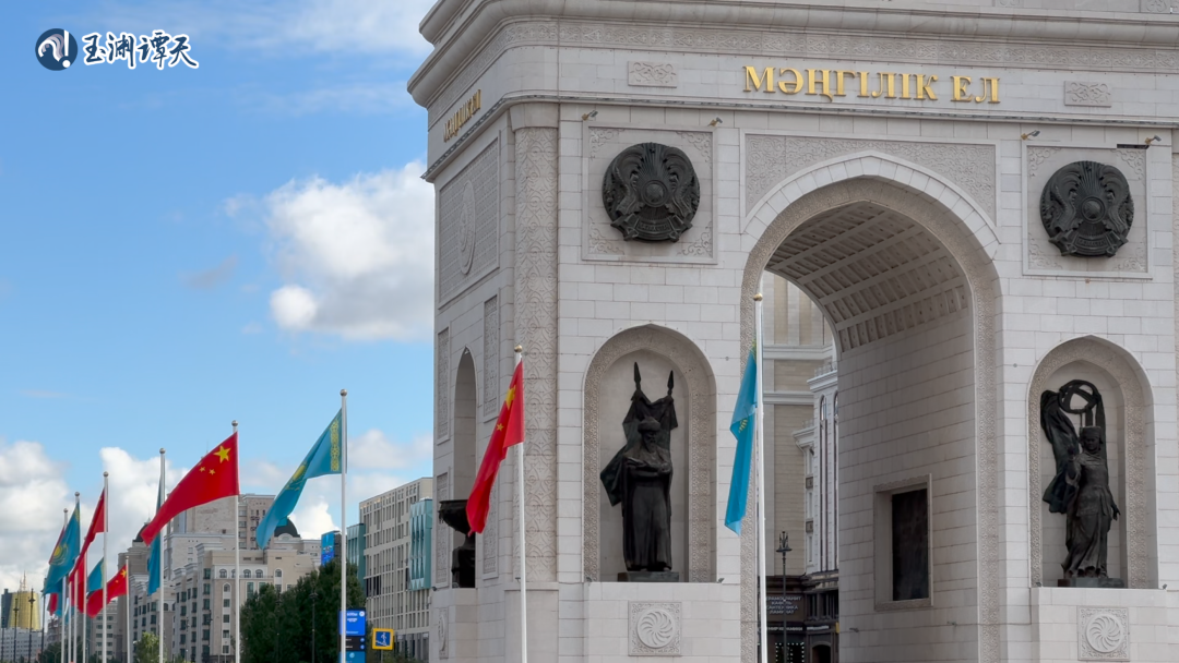 譚主抵達(dá)阿斯塔納,象征著哈薩克斯坦歷史的“凱旋門”周圍飄揚著歡迎旗幟