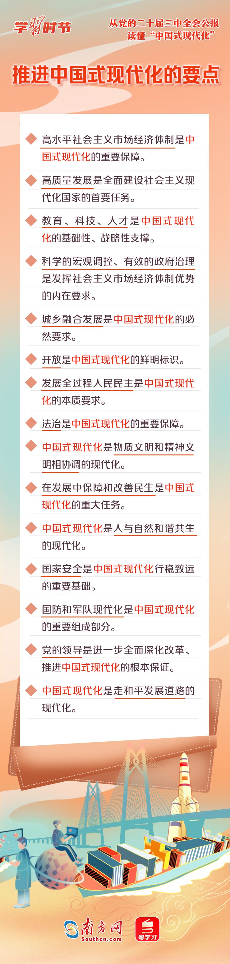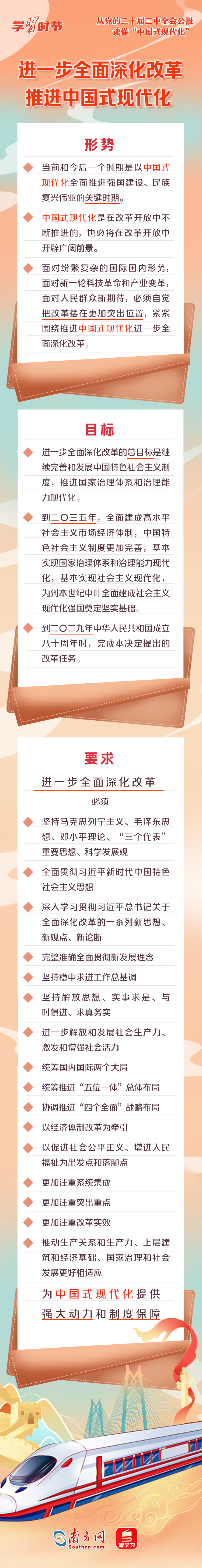 中國式現(xiàn)代化是中國共產(chǎn)黨和中國人民長期實(shí)踐探索的成果,是一項(xiàng)偉大而艱巨的事業(yè)。全會(huì)公報(bào)中,“中國式現(xiàn)代化”一詞被反復(fù)提及,深刻闡述了進(jìn)一步全面深化改革與推進(jìn)中國式現(xiàn)代化的關(guān)系,以及中國式現(xiàn)代化的重要保障、必然要求、本質(zhì)要求等重要內(nèi)容。一起來學(xué)習(xí)!