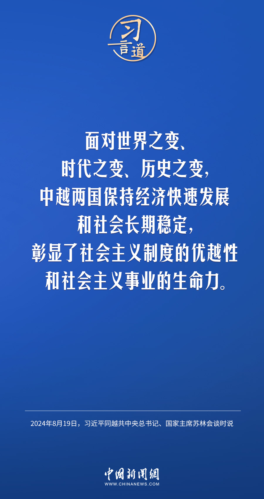 8月19日,中共中央總書(shū)記、國(guó)家主席習(xí)近平在北京人民大會(huì)堂同來(lái)華進(jìn)行國(guó)事訪問(wèn)的越共中央總書(shū)記、國(guó)家主席蘇林舉行會(huì)談。習(xí)近平指出——