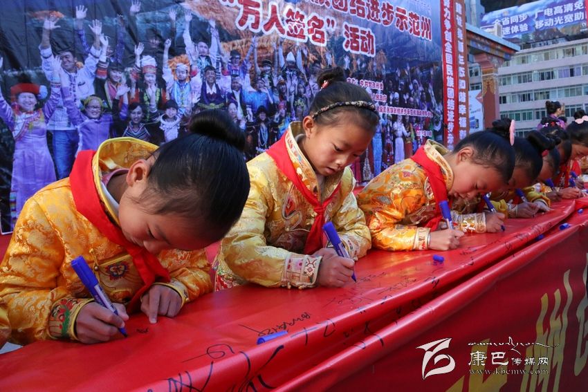 州人大常委會(huì)副主任李致民宣布創(chuàng)建全國(guó)民族團(tuán)結(jié)進(jìn)步示范州“萬(wàn)人簽名”活動(dòng)正式開始后,州領(lǐng)導(dǎo)汪洋、李致民、楊國(guó)元、范文華、蔣秀英、楊學(xué)康以及甘孜軍分區(qū)、駐州武警部隊(duì)領(lǐng)導(dǎo)同州級(jí)機(jī)關(guān)、志愿者、個(gè)體工商戶、學(xué)生、駐軍、政法干警、康定縣黨政機(jī)關(guān)干部代表近千人,陸續(xù)到“萬(wàn)人簽名”條幅上簽下了自己的姓名。