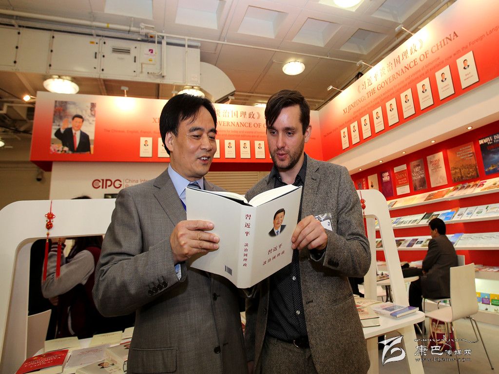 4月14日,中國國際出版集團(tuán)副總裁陸彩榮(左)在倫敦書展上向一名英國讀者介紹《習(xí)近平談治國理政》(繁體中文版)一書。第44屆倫敦書展當(dāng)天正式開幕。首次亮相倫敦書展的《習(xí)近平談治國理政》多文種版圖書受到各界的極大關(guān)注,成為本屆書展中國展團(tuán)的一大亮點(diǎn)。陸彩榮在倫敦書展上宣布,《習(xí)近平談治國理政》一書全球發(fā)行量突破400萬冊(cè),其中海外發(fā)行40萬冊(cè),這是改革開放以來,中國國家領(lǐng)導(dǎo)人著作海外發(fā)行的最高紀(jì)錄。新華社記者 韓巖 攝