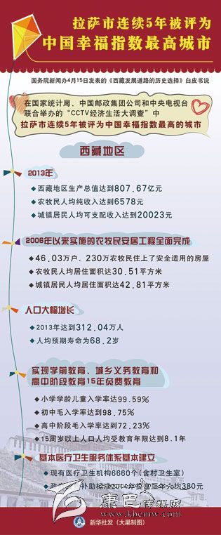 新華社北京4月15日電(記者張曉松、郭麗琨)白皮書說,西藏絕大多數(shù)人口擺脫了延續(xù)上千年的貧困,基本達(dá)到了小康生活水平。在國家統(tǒng)計(jì)局、中國郵政集團(tuán)公司和中央電視臺聯(lián)合舉辦的“CCTV經(jīng)濟(jì)生活大調(diào)查”中,拉薩市連續(xù)5年被評為中國幸福指數(shù)最高的城市。