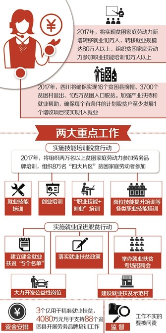 2017年,四川要“確保實(shí)現(xiàn)16個(gè)貧困縣摘帽、3700個(gè)貧困村退出、105萬貧困人口脫貧。加強(qiáng)產(chǎn)業(yè)扶持和就業(yè)幫助,確保每個(gè)有條件的計(jì)劃脫貧戶至少發(fā)展1個(gè)增收項(xiàng)目或?qū)崿F(xiàn)1人就業(yè)”的目標(biāo)。