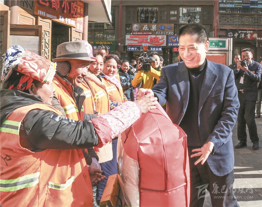 “你們每月工資多少?都按時領(lǐng)到了嗎?”在將軍橋環(huán)衛(wèi)點,劉成鳴與環(huán)衛(wèi)工人親切交談,并一一握手問好。劉成鳴代表州四套班子向奮戰(zhàn)在環(huán)衛(wèi)戰(zhàn)線上的全體干部職工致以崇高敬意和新春問候,對環(huán)衛(wèi)工人為創(chuàng)造康定潔凈、舒適、優(yōu)美的市容環(huán)境所付出的辛勤勞動表示衷心感謝。他說,環(huán)衛(wèi)工作特別辛苦,又臟又累,環(huán)衛(wèi)工人以“寧愿一人臟、換來萬人潔”的奉獻精神,起早摸黑,頂風冒雪,不畏嚴寒,埋頭苦干,特別在去年我州舉辦一系列重大節(jié)慶活動中出色完成了工作任務,在平凡的工作崗位上做出了不平凡的業(yè)績,為推動我州經(jīng)濟社會發(fā)展作出了積極的貢獻。他希望大家在新的一年里,再接再厲,繼續(xù)發(fā)揚無私奉獻精神,立足本職,愛崗敬業(yè),努力拼搏,再創(chuàng)佳績,把康定打扮得更加靚麗、更加美好,為城市環(huán)境衛(wèi)生建設做出新的貢獻。