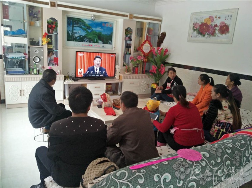 在長(zhǎng)沙貢瑪鄉(xiāng),巴格瑪尼石刻合作社全體社員,通過(guò)便攜式“馬背”電視機(jī)收看開(kāi)幕會(huì)盛況。社員尼澤說(shuō):“國(guó)家提出精準(zhǔn)扶貧政策后,縣委政府千方百計(jì)的幫助我們尋找致富門(mén)路,引導(dǎo)我們通過(guò)組建合作社脫貧致富奔康,我們的日子越來(lái)越好,這使我明白了一個(gè)道理,國(guó)家強(qiáng)則民族強(qiáng),真心祝愿祖國(guó)越來(lái)越好。”