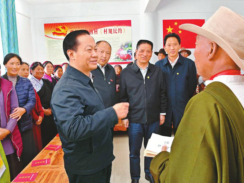 在村民澤翁家中,彭清華細(xì)致察看整修后的旅游民宿,了解房屋結(jié)構(gòu)功能、抗震設(shè)防標(biāo)準(zhǔn)和修建費(fèi)用等,與一家人拉家常、聊增收,鼓勵(lì)他們?cè)俳釉賲?,把日子越過越好。雅德鄉(xiāng)交納村平均海拔3300米,是典型的高原藏區(qū)貧困村。彭清華沿著崎嶇的山路步行來到貧困戶亞瑪忠登和根呷家中,與他們圍坐在一起,共同分析致貧原因和脫貧進(jìn)展,詳細(xì)了解各項(xiàng)幫扶措施落實(shí)情況,為他們脫貧增收鼓勁支招。在交納村村委會(huì)辦公室,彭清華與在這里參加合作社入股分紅活動(dòng)的村民們親切交談。他對(duì)在場的村干部和鄉(xiāng)親們說,習(xí)近平總書記、黨中央十分牽掛藏區(qū)群眾,對(duì)扎實(shí)做好藏區(qū)經(jīng)濟(jì)發(fā)展、民生改善和社會(huì)和諧穩(wěn)定特別是脫貧攻堅(jiān)等方面工作作出一系列重要指示、提出明確要求。我們要認(rèn)真學(xué)習(xí)領(lǐng)會(huì)、堅(jiān)決貫徹落實(shí)。希望鄉(xiāng)親們始終銘記習(xí)近平總書記的深切關(guān)懷,進(jìn)一步堅(jiān)定脫貧信心,大力發(fā)展生產(chǎn),積極學(xué)習(xí)技術(shù),尤其要重視孩子們的培養(yǎng)教育,讓適齡少年兒童都能接受義務(wù)教育,堅(jiān)決阻斷貧困代際傳遞。要充分發(fā)揮群眾的積極性和主動(dòng)性,引導(dǎo)村民依靠自己的辛勤勞動(dòng)拔窮根、摘窮帽,早日脫貧致富奔小康。