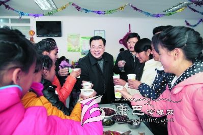 胡昌升斟滿酒杯一桌一桌地敬大家,祝福大家春節(jié)愉快、萬事如意。胡昌升動情地說,尊敬的各位老師、親愛的同學們,大家春節(jié)好!今天我和你們的汪洋爸爸、忠義爸爸和大家歡歡喜喜過除夕,在這里我要感謝所有的老師們,正是因為你們辛勤的工作,用心用情地關(guān)心孩子們,所以孩子們的臉上綻放出了幸福的笑容,你們把福利院當成自己的家,愛校如家,愛孩子們?nèi)缱?,你們用心用情、嘔心瀝血、殫精竭慮,今天我要感謝你們,感謝全州所有的老師們。