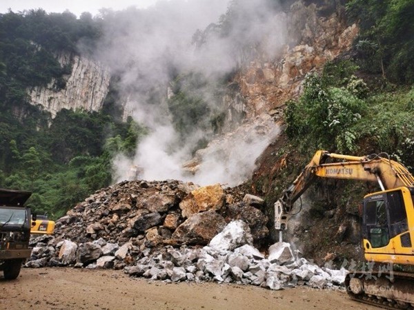 周宗海說(shuō),為搶通中斷路段,珙縣自然資源和規(guī)劃局于18日中午一點(diǎn)開(kāi)始,組織機(jī)具10余臺(tái) ,人員20余人進(jìn)行連續(xù)加班作業(yè),對(duì)垮塌巖體進(jìn)行爆破、清運(yùn),清理碎石約15000噸,于19日晚上十點(diǎn)搶通了該路段。