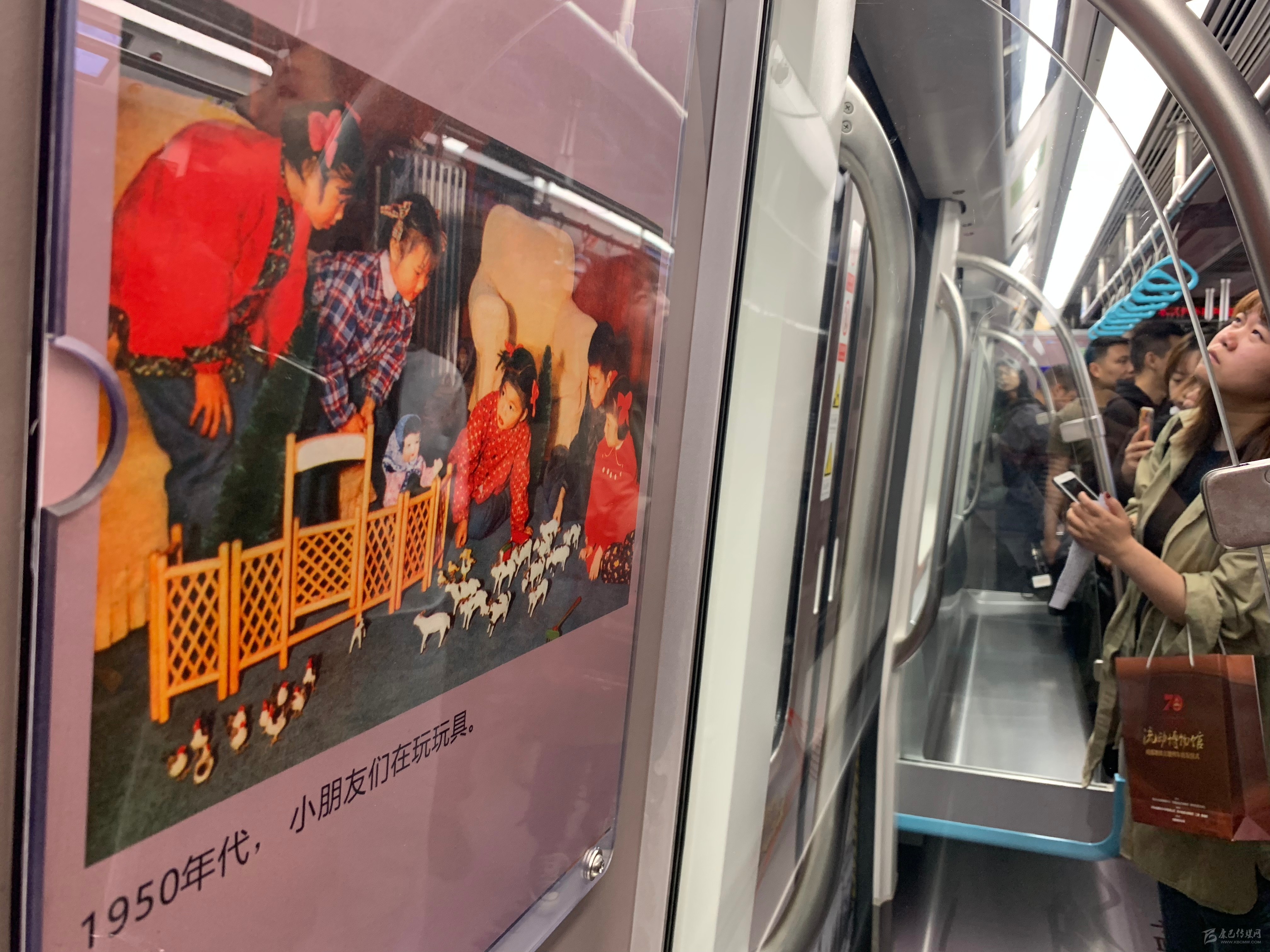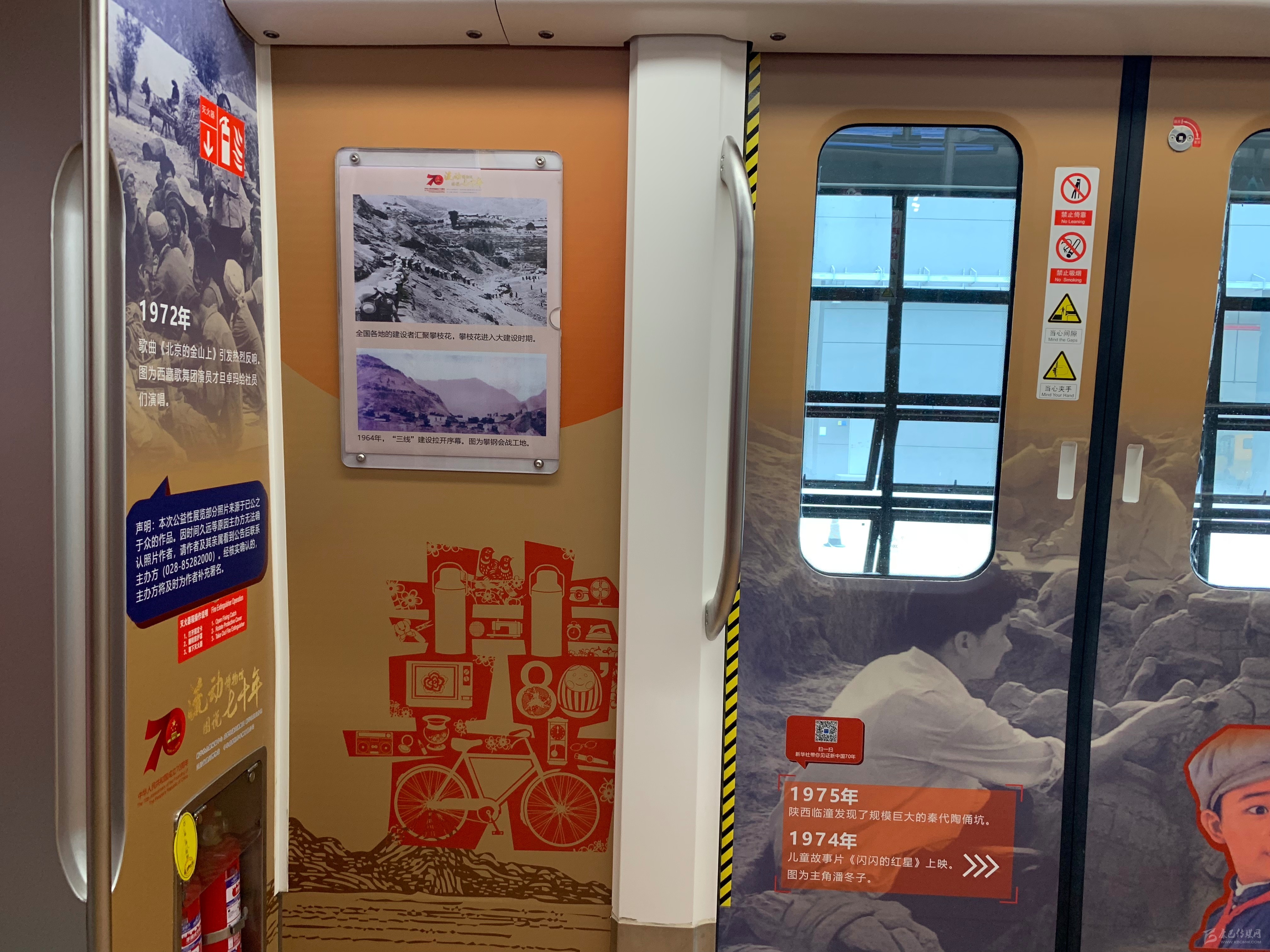 這趟主題列車由新華通訊社與成都軌道交通集團(tuán)、四川省建川博物館、中車集團(tuán)成都公司共同打造。主辦方精心收集、挑選了1949-2019年的300多張重要?dú)v史照片和文物復(fù)印件,通過(guò)時(shí)間長(zhǎng)廊的設(shè)計(jì),將新中國(guó),特別是四川、成都70年的奮斗史和普通人衣食住行的巨大變化逐年呈現(xiàn)。主題列車上還設(shè)置了多處二維碼,掃碼即可進(jìn)入主辦方開(kāi)設(shè)的更多專題,把“流動(dòng)博物館”延伸到“網(wǎng)絡(luò)博物館”。