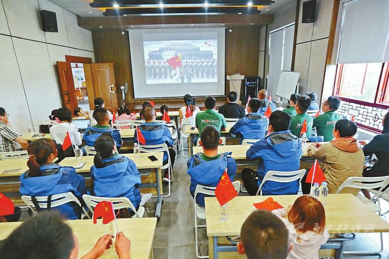 10月1日上午,雅安市蘆山縣龍門(mén)鎮(zhèn)上百名干部群眾聚集到龍門(mén)山莊,共同觀(guān)看直播。
