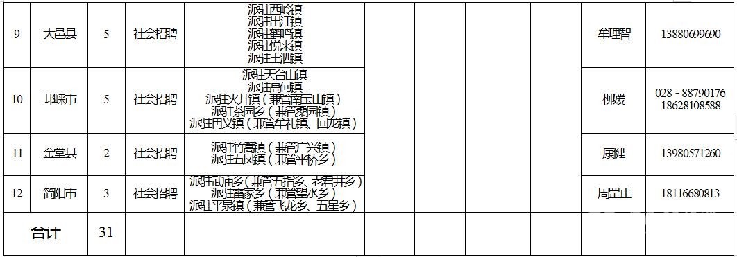 1﹒社會(huì)招聘招募區(qū)(市)縣:成都天府新區(qū)、新都區(qū)、郫都區(qū)、簡(jiǎn)陽市、都江堰市、彭州市、邛崍市、崇州市、金堂縣、新津縣、大邑縣、蒲江縣(具體信息詳見附件1)。