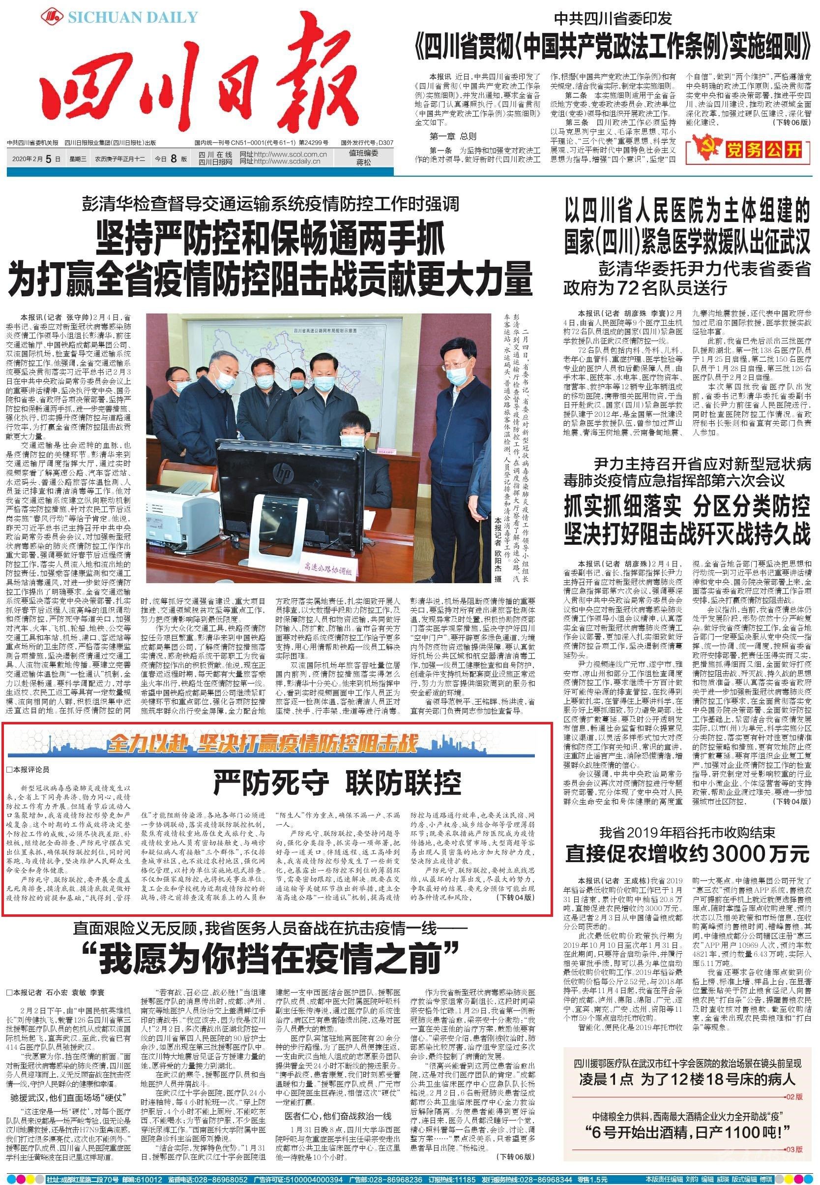 2月4日,省委書記、省委應(yīng)對新型冠狀病毒感染肺炎疫情工作領(lǐng)導(dǎo)小組組長彭清華,前往交通運輸廳、中國鐵路成都局集團公司、雙流國際機場,檢查督導(dǎo)交通運輸系統(tǒng)疫情防控工作。