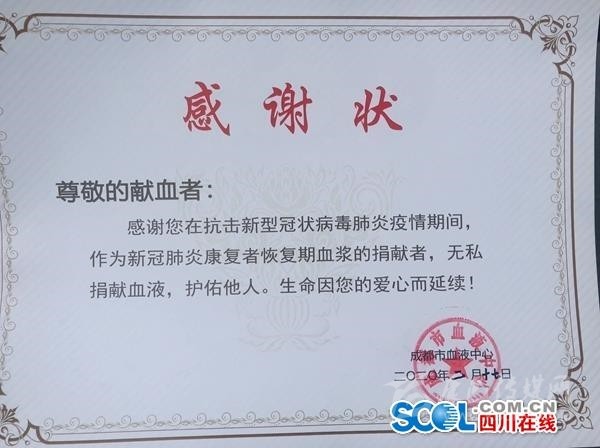 “出院的時(shí)候,我特地與我的主治醫(yī)生說(shuō),有相關(guān)的血液捐贈(zèng)或者其他配合的需求請(qǐng)隨時(shí)聯(lián)系我!”35歲的捐獻(xiàn)者李某表示,這是我首次獻(xiàn)血,我是湖北武漢人,有親戚朋友在成都,當(dāng)作成都是第二故鄉(xiāng),我是1月22日到成都探親,23日下午發(fā)熱在成都市公共衛(wèi)生臨床醫(yī)療中心確診和治療,2月6日出院。在出院治療期間,李某表示,最難忘的就是每次醫(yī)生來(lái)查房,都會(huì)鼓勵(lì)我說(shuō),放心你一定會(huì)康復(fù)的,“我難忘成都這份恩情!”
