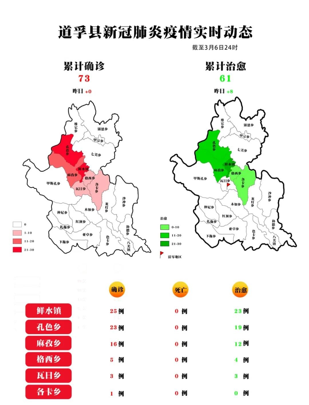 截至3月6日24時(shí),我州累計(jì)報(bào)告確診病例78例,累計(jì)治愈出院66人(道孚縣61人、康定市2人、色達(dá)縣2人、稻城縣1人),其余12人均在定點(diǎn)醫(yī)院隔離治療,25名密切接觸者正在接受醫(yī)學(xué)觀察。我州道孚縣連續(xù)8天無確診病例報(bào)告,其余17個(gè)縣(市)連續(xù)32天無確診病例報(bào)告。
