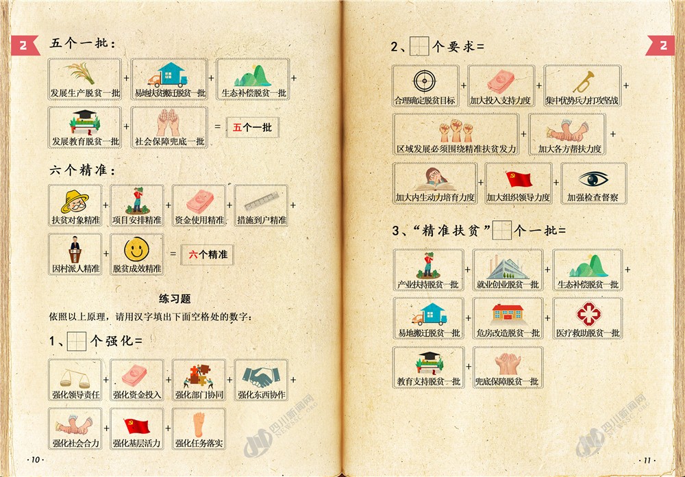 四川新聞網(wǎng)成都8月26日訊 又是周三啦?說好的脫貧攻堅小課堂如期而至!目前,打贏脫貧攻堅戰(zhàn)進入最后沖刺的關鍵階段,四川還有很多硬仗要打,很多“硬骨頭”要啃,防止返貧致貧任務繁重,脫貧攻堅工作力度還需要加強,面臨的困難和挑戰(zhàn)依然十分艱巨。為了深入推進精準扶貧精準脫貧,奪取全省脫貧攻堅收官之戰(zhàn)全面勝利,本課采用上一課剛剛學到的數(shù)字來總結歸納了脫貧攻堅政策和方法的關鍵知識點,以便讓廣大同學進一步掌握這些政策、運用這些方法,提高政策受益覆蓋面及知曉率,確保各項政策落到實處。