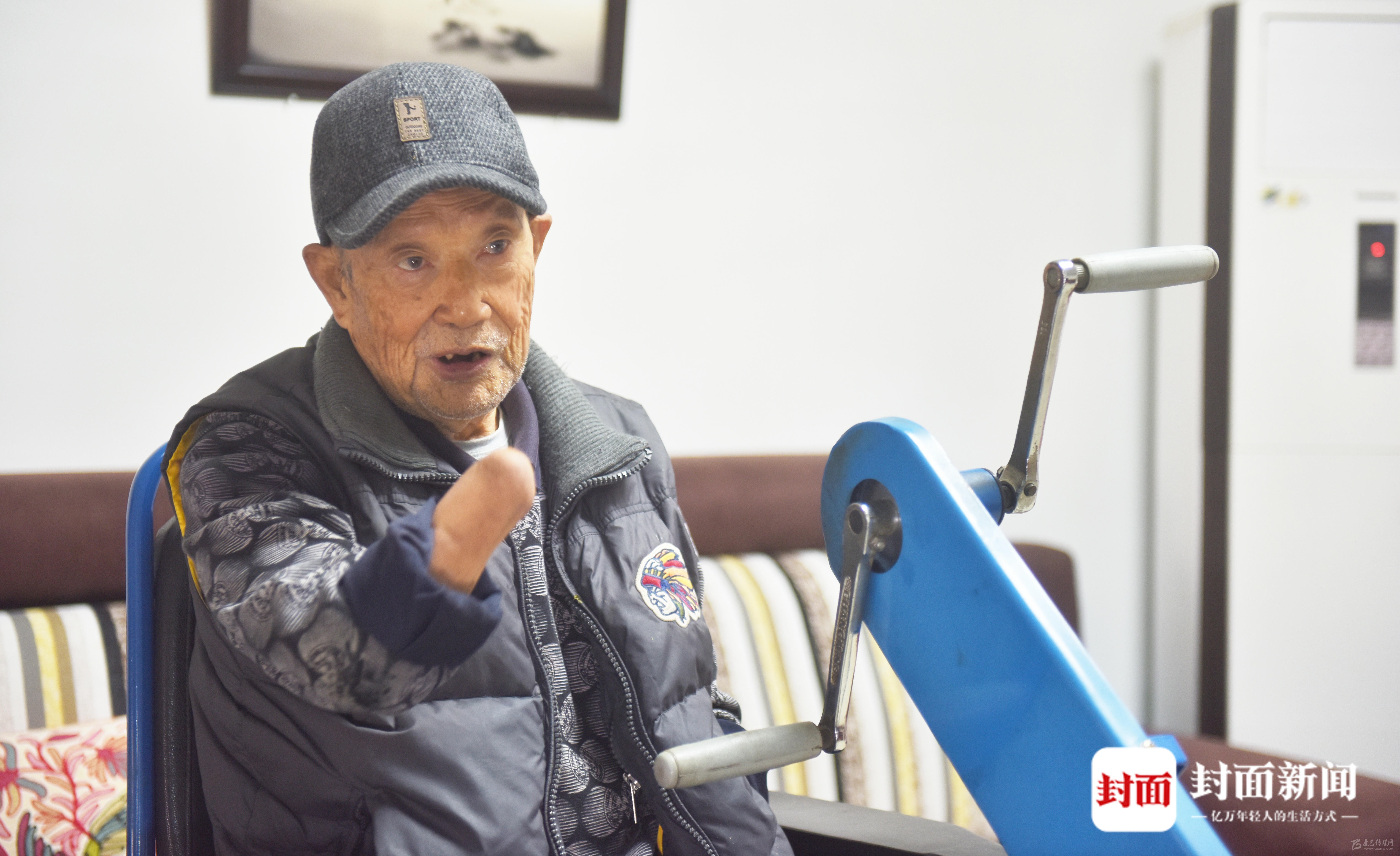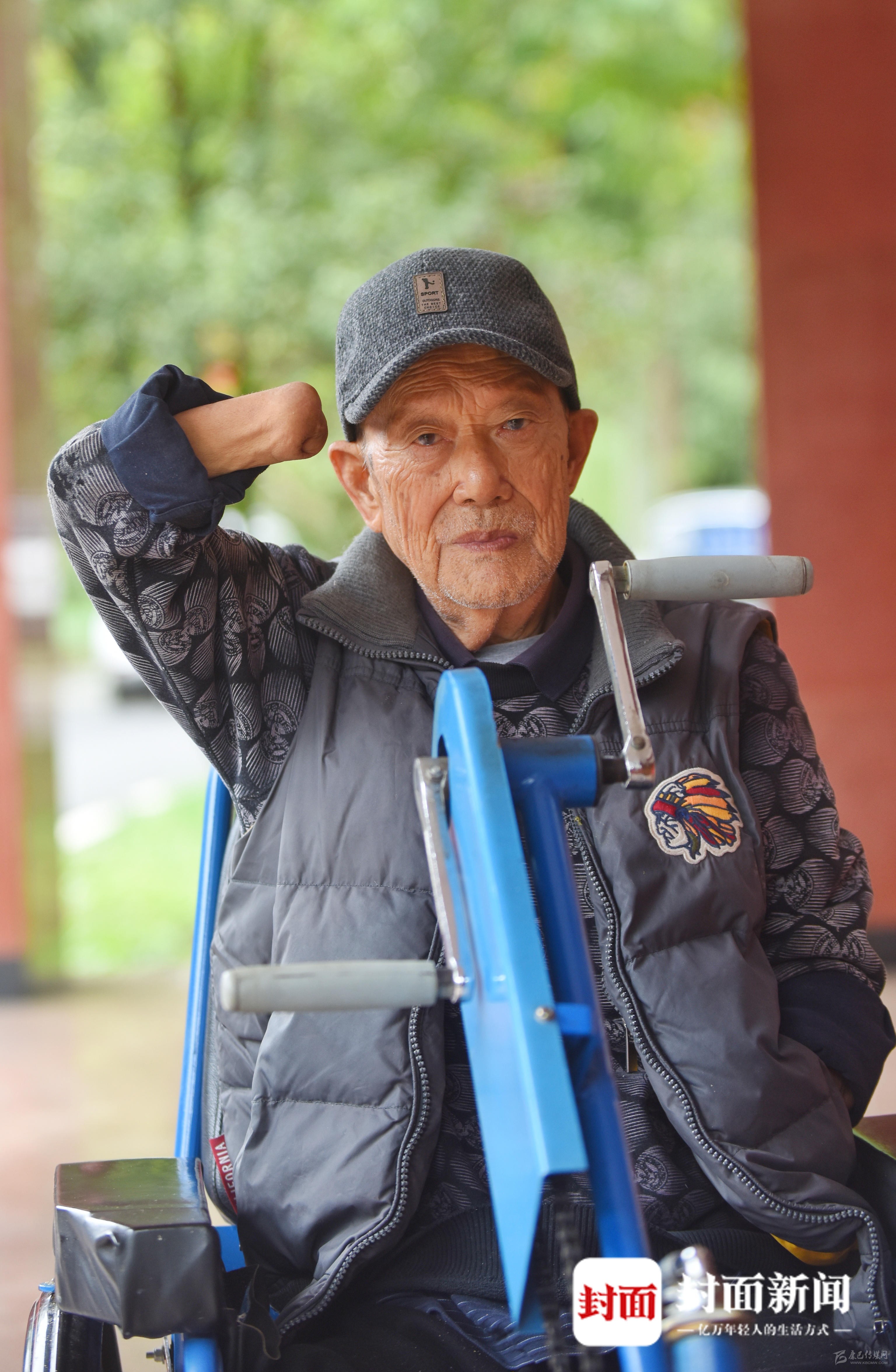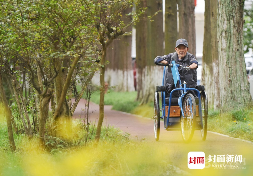 老人四肢殘缺,騎著特制的手搖三輪車(chē),也能行動(dòng)自如。距離老人被截肢已經(jīng)70年了,他早已學(xué)會(huì)獨(dú)立生活。