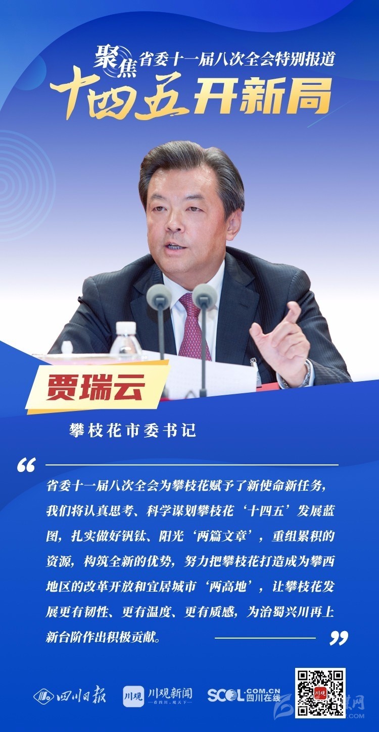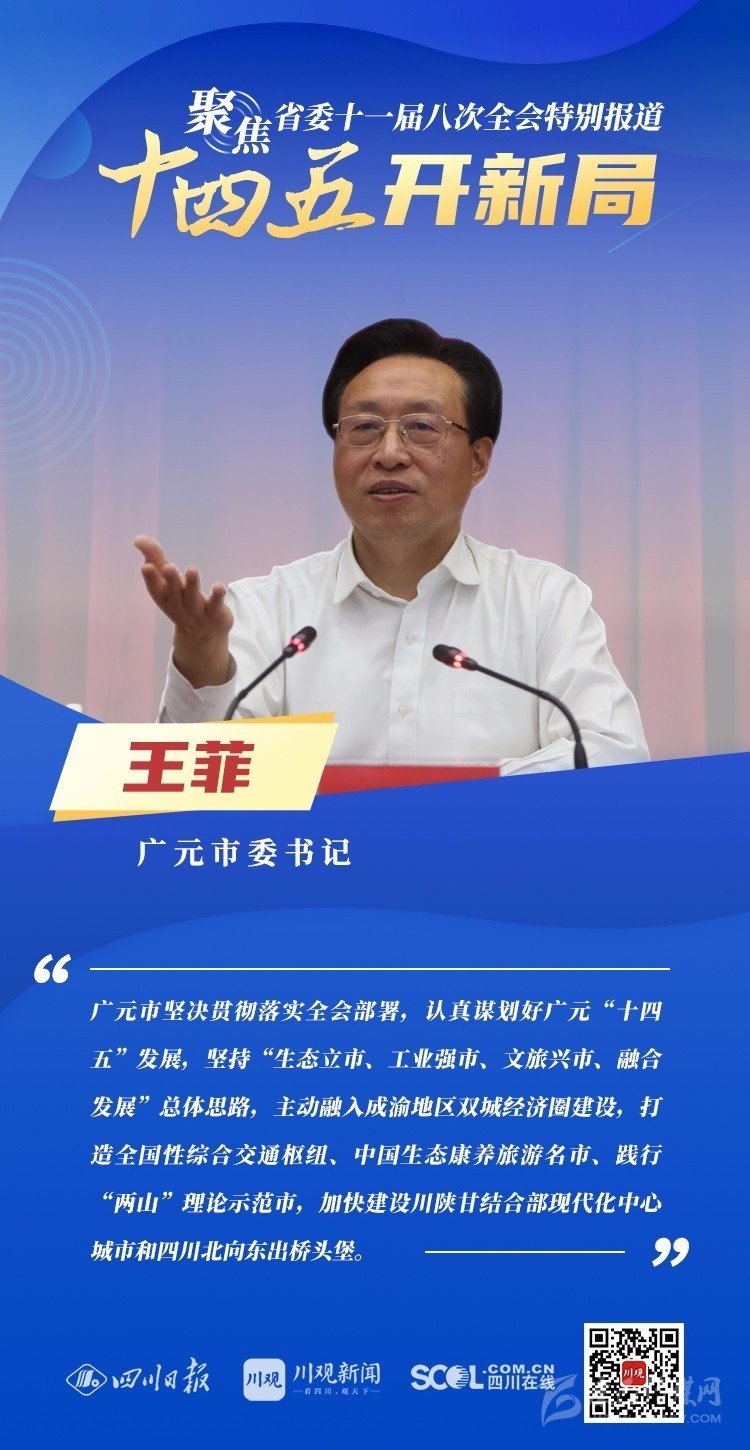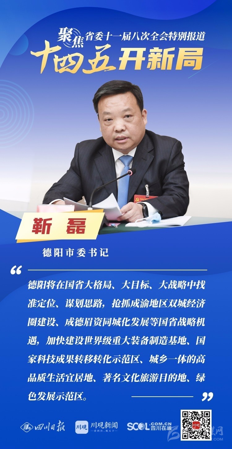 12月3日,中共四川省委十一屆八次全會在成都開幕,全會將深入學習貫徹黨的十九屆五中全會精神,審議《中共四川省委關(guān)于制定四川省國民經(jīng)濟和社會發(fā)展第十四個五年規(guī)劃和二〇三五年遠景目標的建議(討論稿)》,為未來5年乃至更長時期四川發(fā)展謀劃新藍圖 。