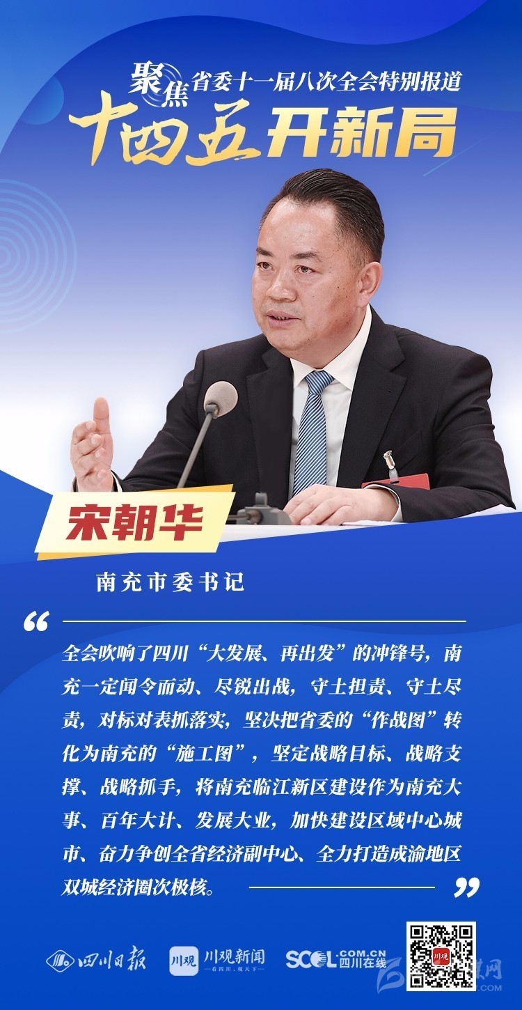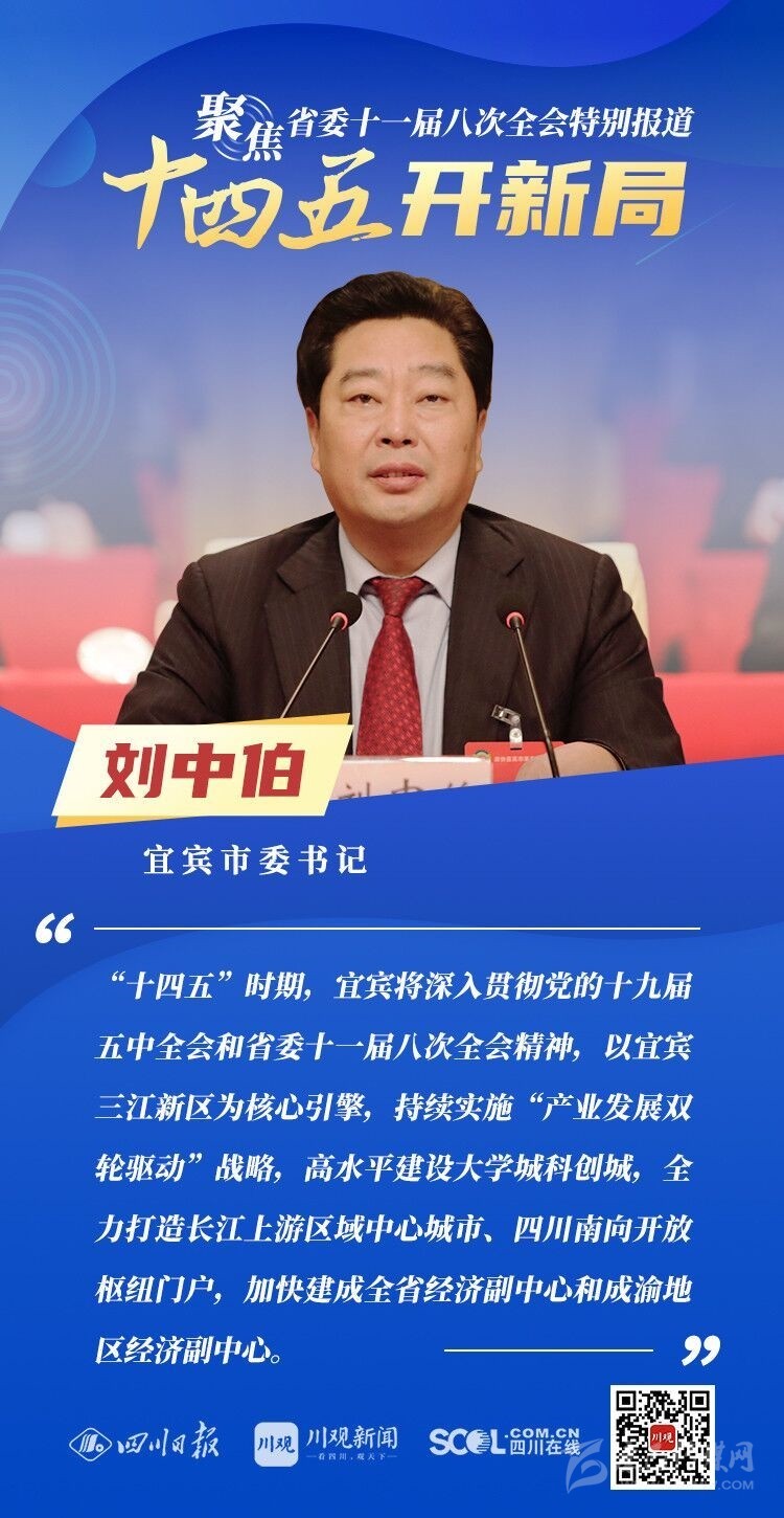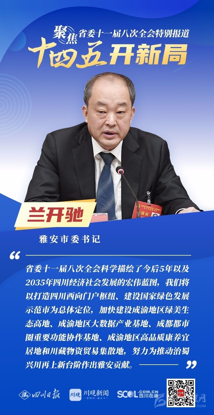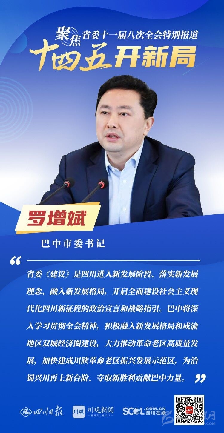 12月3日,中共四川省委十一屆八次全會在成都開幕,全會將深入學習貫徹黨的十九屆五中全會精神,審議《中共四川省委關(guān)于制定四川省國民經(jīng)濟和社會發(fā)展第十四個五年規(guī)劃和二〇三五年遠景目標的建議(討論稿)》,為未來5年乃至更長時期四川發(fā)展謀劃新藍圖 。