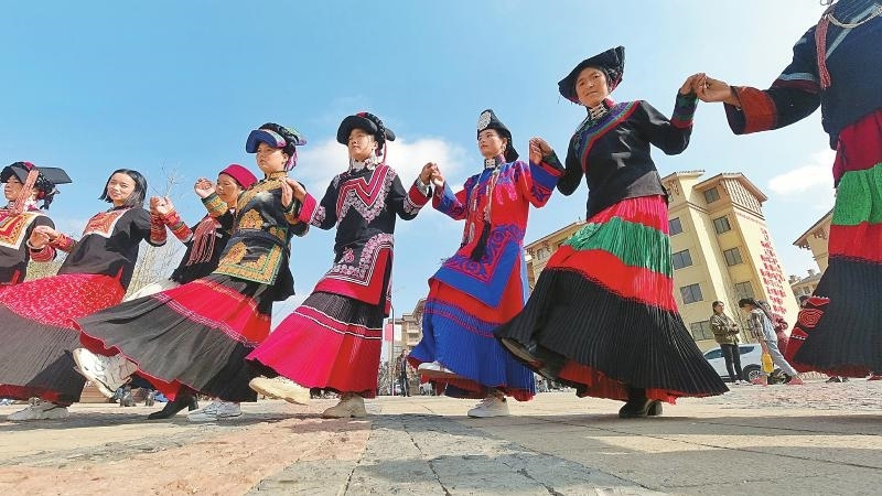 人還沒到達(dá)沐恩邸社區(qū)廣場(chǎng),陣陣歡快的音樂聲就傳來了。走近一看,近百名彝族群眾和游客牽手圍成一圈,踏著歌聲來回跳舞?!拔覀兲疬_(dá)體舞就是要慶祝脫貧,感恩來之不易的新生活,歡慶彝家傳統(tǒng)節(jié)日彝歷新年?!鄙鐓^(qū)居民熱烈阿洛說。
