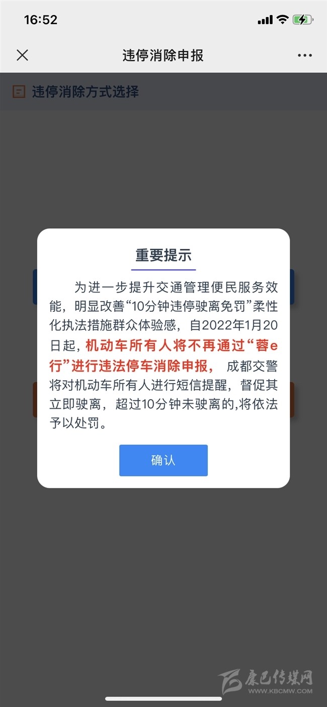 今天,記者獲悉,為進(jìn)一步提升交通管理便民服務(wù)效能,明顯改善“10分鐘違停駛離免罰”柔性化執(zhí)法措施群眾體驗(yàn)感,自2022年1月20日起, 機(jī)動車所有人將不再通過“蓉e行”進(jìn)行違法停車消除申報,成都交警將對機(jī)動車所有人進(jìn)行短信提醒,督促其立即駛離,超過10分鐘未駛離的,將依法予以處罰。