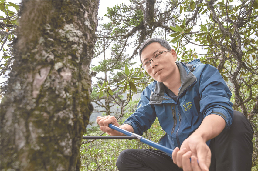 中科院成都山地所研究員王文志在采集冷杉的年輪樣本。