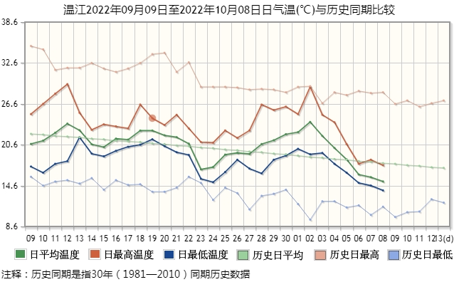 在盆地區(qū),溫江國家氣象站的觀測顯示,10月2日以來,當(dāng)?shù)氐娜掌骄鶜鉁亍⑷兆罡邭鉁?、日最低氣溫都是一路快速下行,使前期偏高的氣溫向著歷史均值快速回歸。