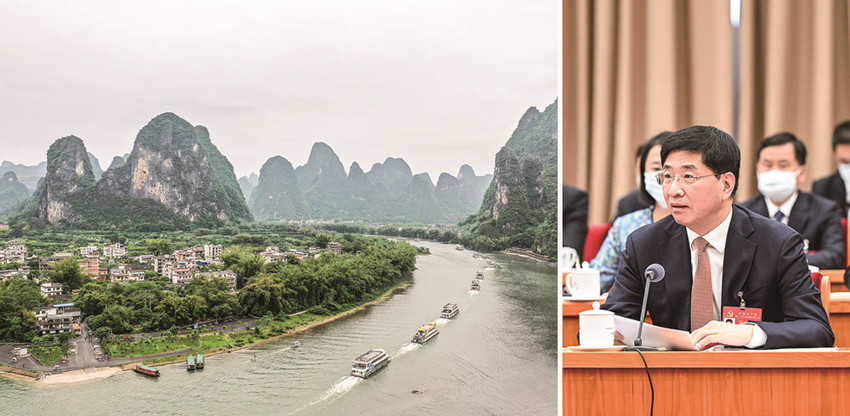 拼版照片:右圖為黨的二十大代表周家斌在廣西代表團討論中發(fā)言;左圖為漓江廣西陽朔段。 周家斌代表說,近年來,桂林市堅持綠水青山就是金山銀山的理念,漓江生態(tài)環(huán)境持續(xù)向好,煥發(fā)出新的生機。我們要繼續(xù)堅持生態(tài)優(yōu)先、綠色發(fā)展,像守護生命一樣守護一江綠水、兩岸青山,努力創(chuàng)造宜業(yè)、宜居、宜樂、宜游的良好環(huán)境。 新華社 發(fā)