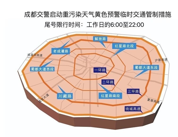三、工作日的6:00至22:00,在四環(huán)路(成都繞城高速公路G4202,不含)以?xún)?nèi)區(qū)域道路,實(shí)行汽車(chē)尾號(hào)限行,按照機(jī)動(dòng)車(chē)號(hào)牌(含臨時(shí)號(hào)牌汽車(chē))的最后一位阿拉伯?dāng)?shù)字尾號(hào)限行。即:星期一限尾號(hào)“1”和“6”,星期二限尾號(hào)“2”和“7”;星期三限尾號(hào)“3”和“8”;星期四限尾號(hào)“4”和“9”;星期五限尾號(hào)“5”和“0”。公休日因法定節(jié)假日調(diào)休為工作日的,不限行。
