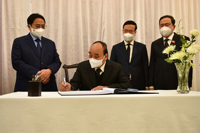 12月2日,越南國家主席阮春福(左二)、總理范明政(左一)等在中國駐越南大使館吊唁江澤民同志。 新華社記者 胡佳麗 攝