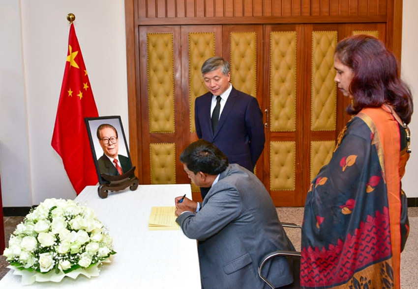 十二月二日,斯里蘭卡總統(tǒng)維克拉馬辛哈在中國駐斯里蘭卡大使館吊唁江澤民同志。 薩米拉 攝(新華社 發(fā))