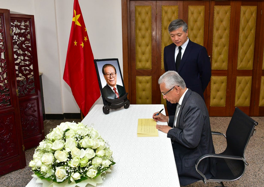 12月2日,毛里求斯總理賈格納特在中國駐毛里求斯大使館吊唁江澤民同志。 中國駐毛里求斯大使館供圖(新華社 發(fā))