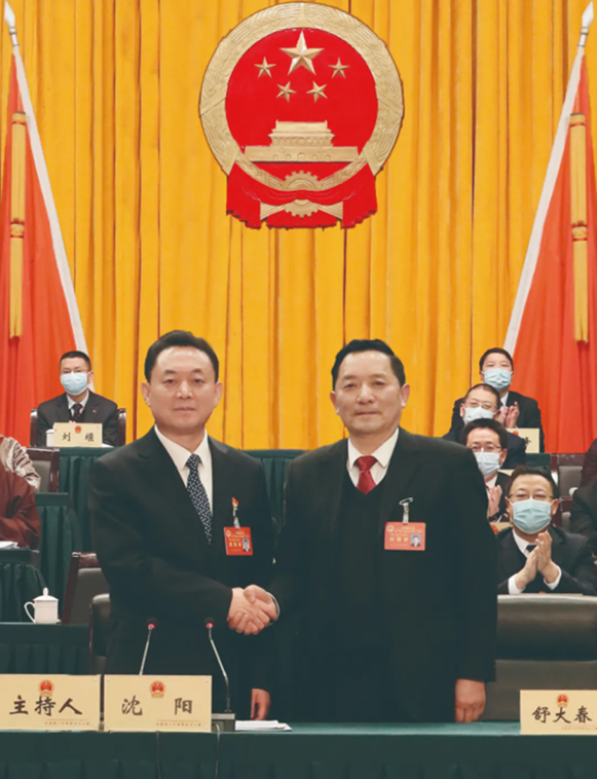 州十三屆人大一次會議上,州委書記沈陽向當選的州人大常委會主任舒大春表示祝賀。
