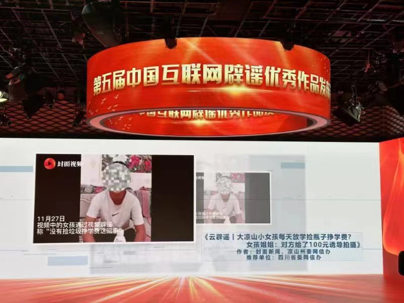 由涼山州委網(wǎng)信辦、封面新聞制作的《云辟謠 | 大涼山小女孩每天放學撿瓶子掙學費?女孩姐姐:對方給了100元誘導拍攝》(點擊查看作品)獲得網(wǎng)絡辟謠版塊社會民生類獎項。