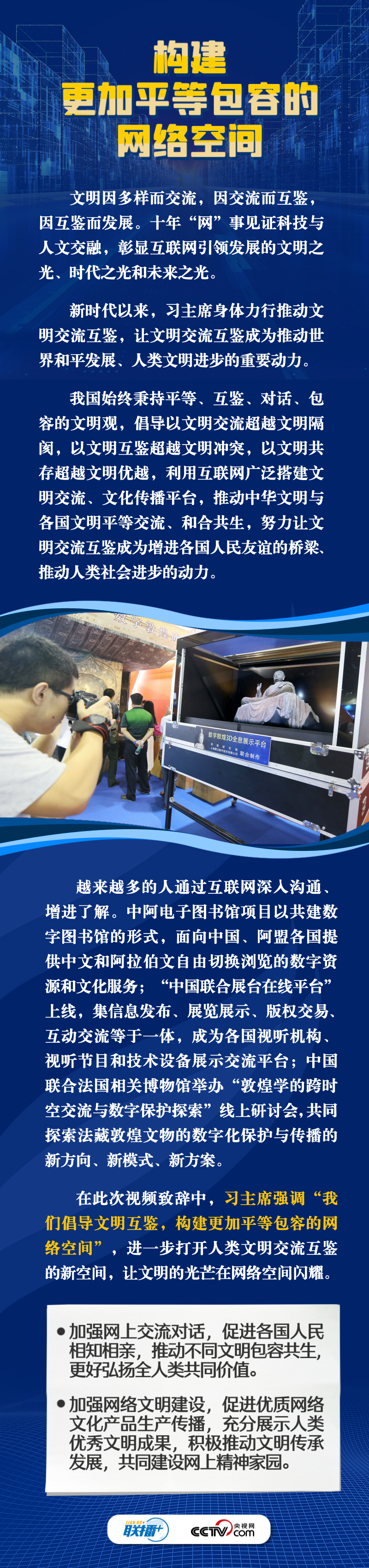 面對新的時(shí)代課題,習(xí)主席在此次視頻致辭中倡導(dǎo)構(gòu)建更加普惠繁榮、更加和平安全、更加平等包容的網(wǎng)絡(luò)空間。這三個(gè)“網(wǎng)絡(luò)空間”具體內(nèi)容是什么?構(gòu)建網(wǎng)絡(luò)“新空間”有什么具體措施?央視網(wǎng)《聯(lián)播+》與您一同學(xué)習(xí)。