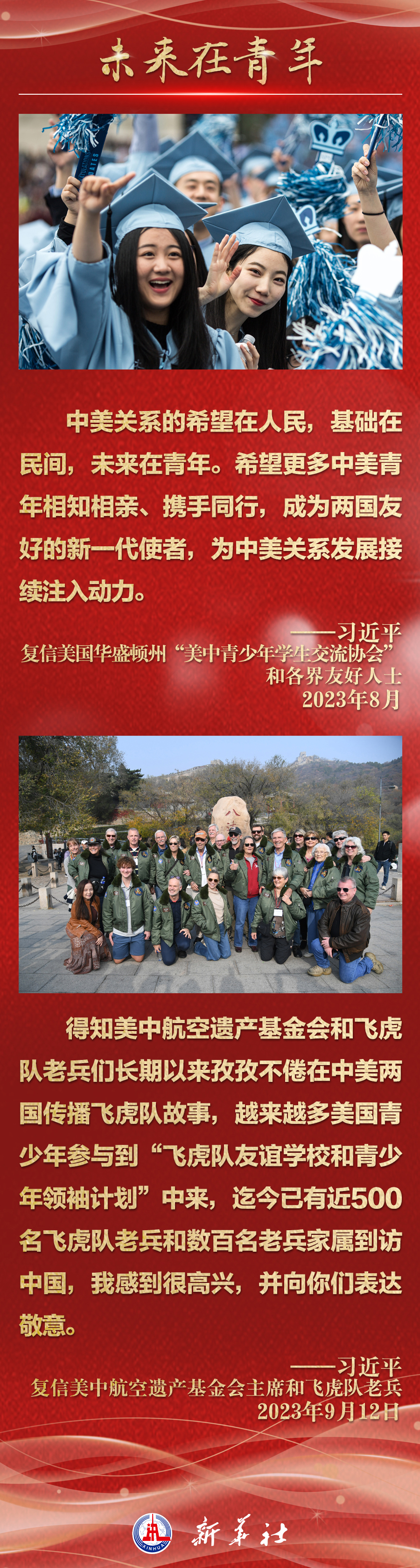 今年以來,從在京會見美國各界人士,到向“鼓嶺緣”中美民間友好論壇等活動致賀信,再到復(fù)信美國華盛頓州“美中青少年學(xué)生交流協(xié)會”、史迪威將軍后人、飛虎隊老兵等友好人士,習(xí)近平主席同美國各界真摯互動,強調(diào)中美關(guān)系基礎(chǔ)在民間,希望在人民,未來在青年,活力在地方。