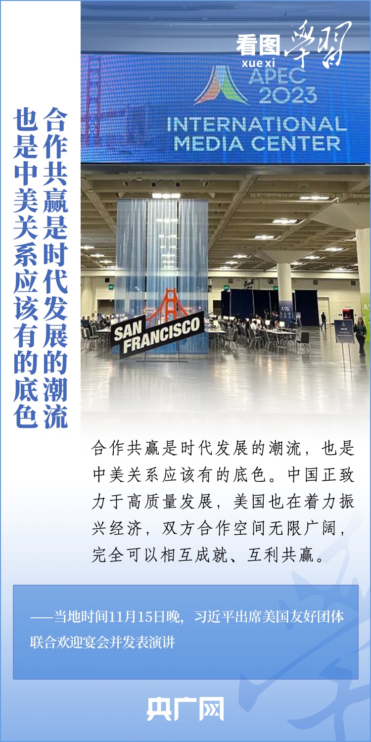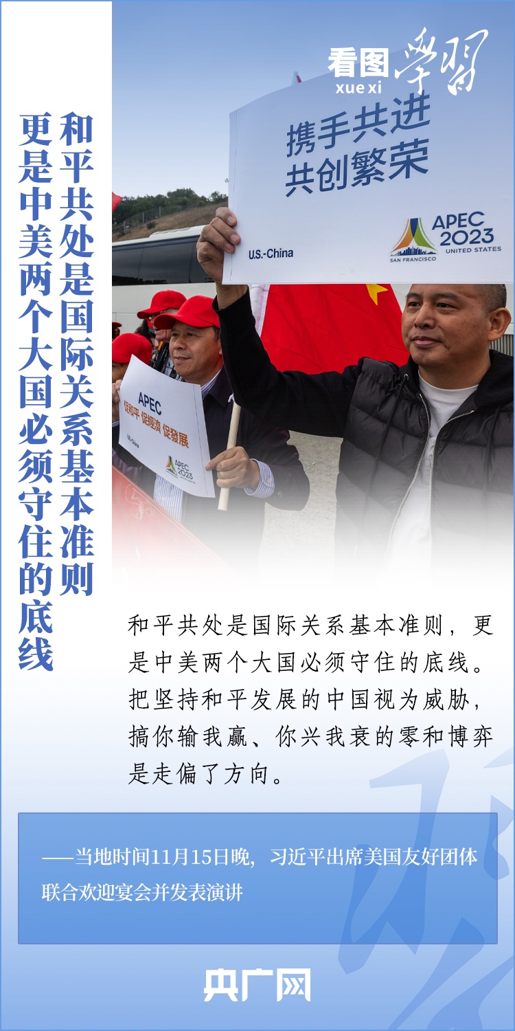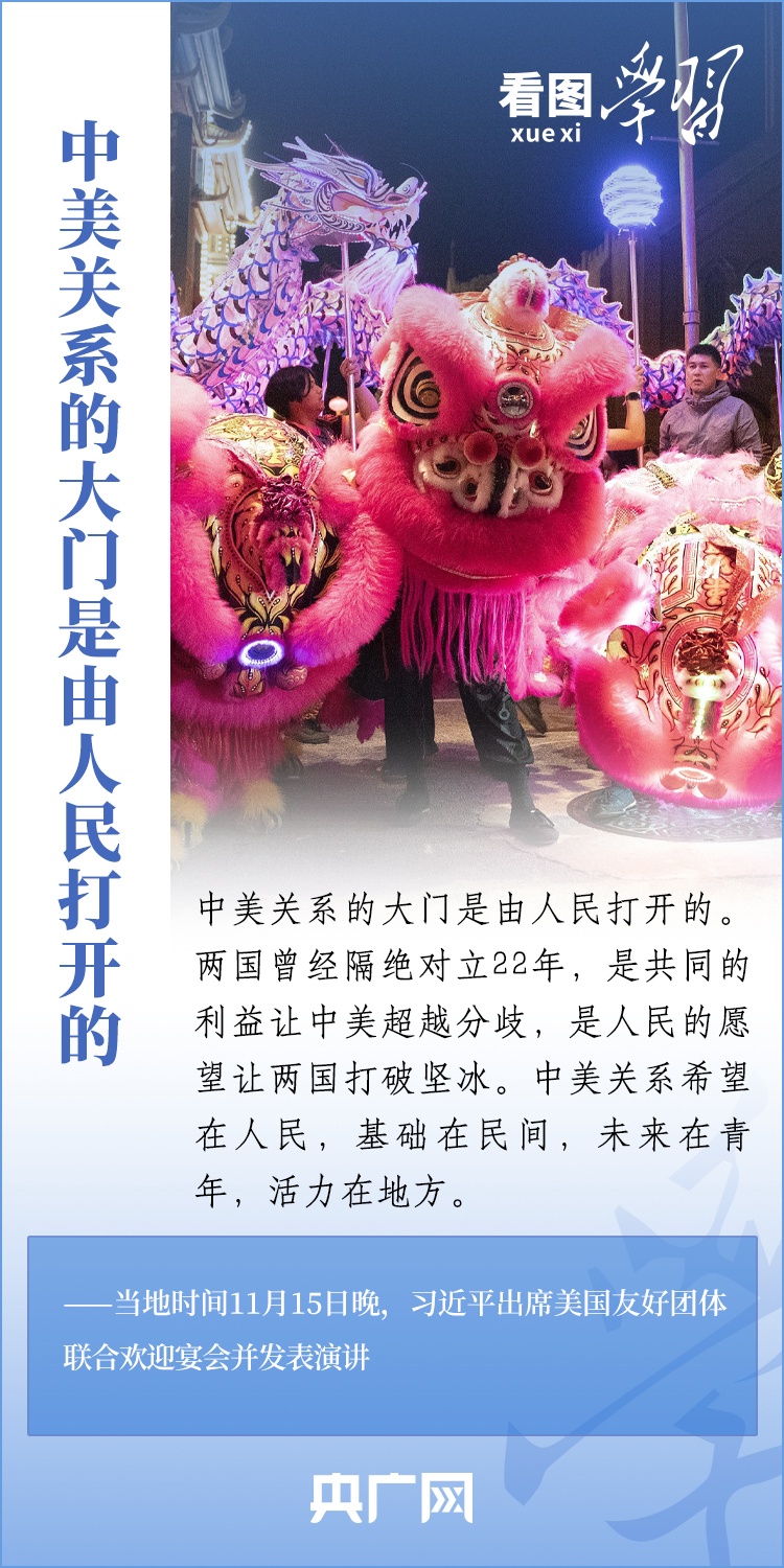 當(dāng)?shù)貢r間11月15日晚,國家主席習(xí)近平在美國舊金山出席美國友好團(tuán)體聯(lián)合舉行的歡迎宴會并發(fā)表重要演講。習(xí)近平主席在演講中系統(tǒng)闡述了關(guān)于中美關(guān)系的一系列觀點、立場、原則,強(qiáng)調(diào)“中美關(guān)系希望在人民,基礎(chǔ)在民間,未來在青年,活力在地方”,希望匯聚起兩國人民的力量,賡續(xù)中美友誼,推進(jìn)中美關(guān)系,努力為促進(jìn)世界和平和發(fā)展作出更大貢獻(xiàn)!一起來學(xué)習(xí)。