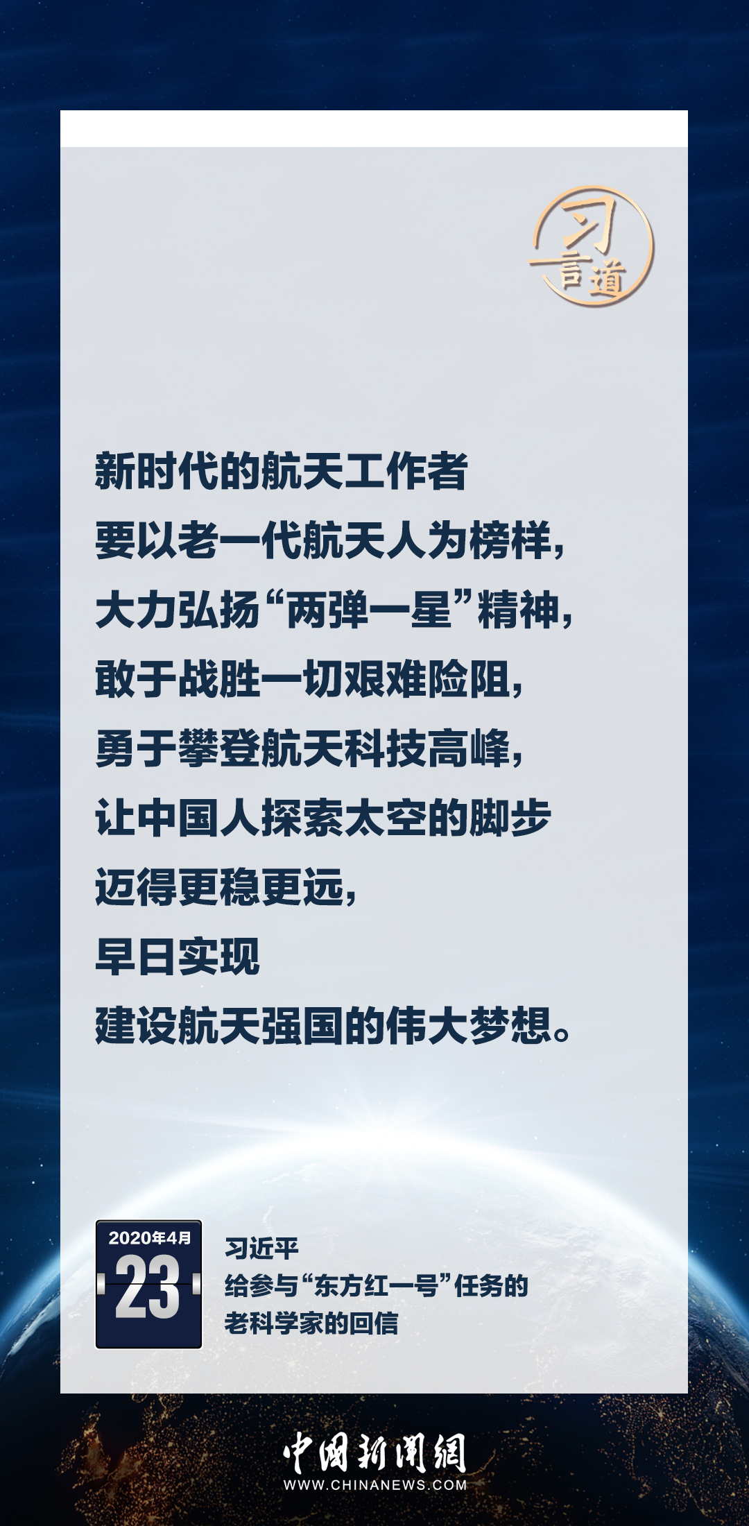 建設(shè)航天強(qiáng)國(guó)要靠一代代人接續(xù)奮斗。在不同場(chǎng)合,習(xí)近平總書(shū)記頻頻提及航天精神,激勵(lì)一代代中國(guó)人不斷奮進(jìn)、筑夢(mèng)太空。