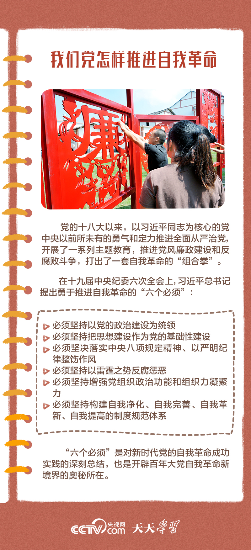 勇于自我革命是我們黨最鮮明的品格和最大的優(yōu)勢,總書記多次對推進黨的自我革命作出重要部署。此次會議上,總書記深刻闡述了黨的自我革命的重要思想,明確提出需要把握好九個問題,并對持續(xù)發(fā)力、縱深推進反腐敗斗爭作出戰(zhàn)略部署。央視網(wǎng)《天天學(xué)習(xí)》與您一起學(xué)習(xí)。