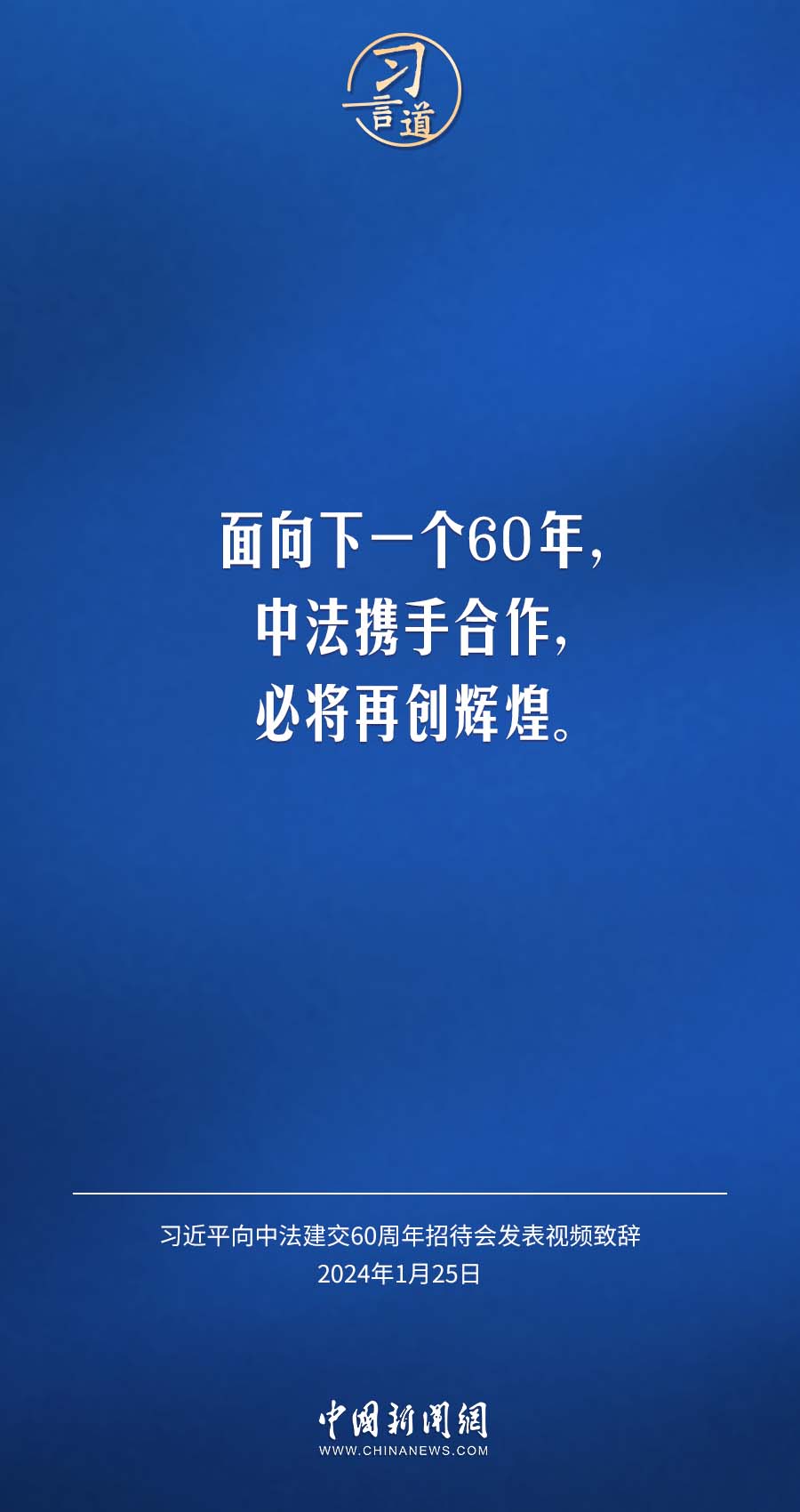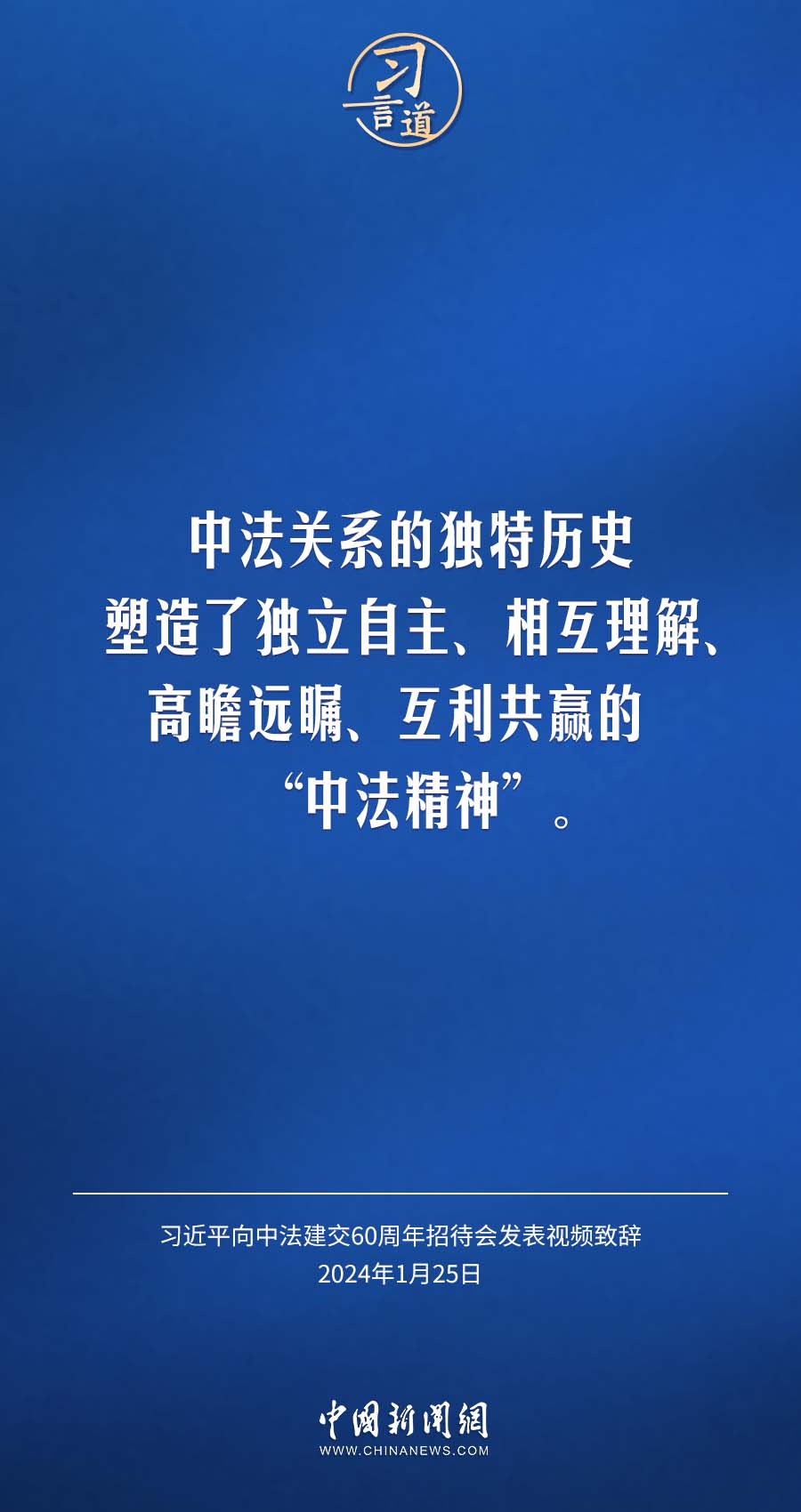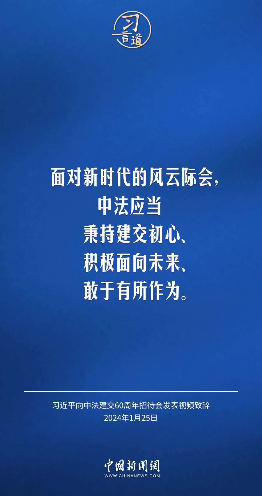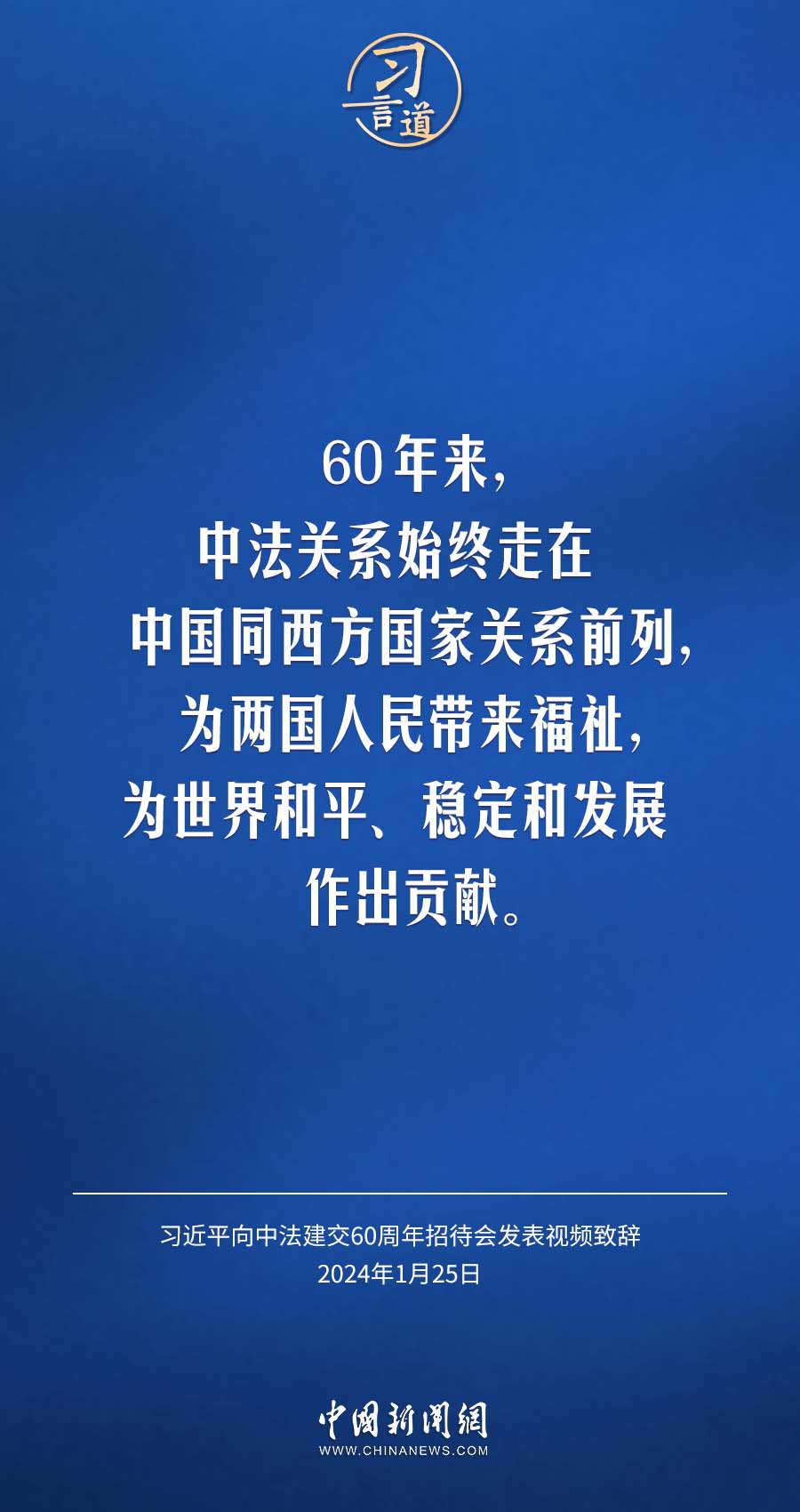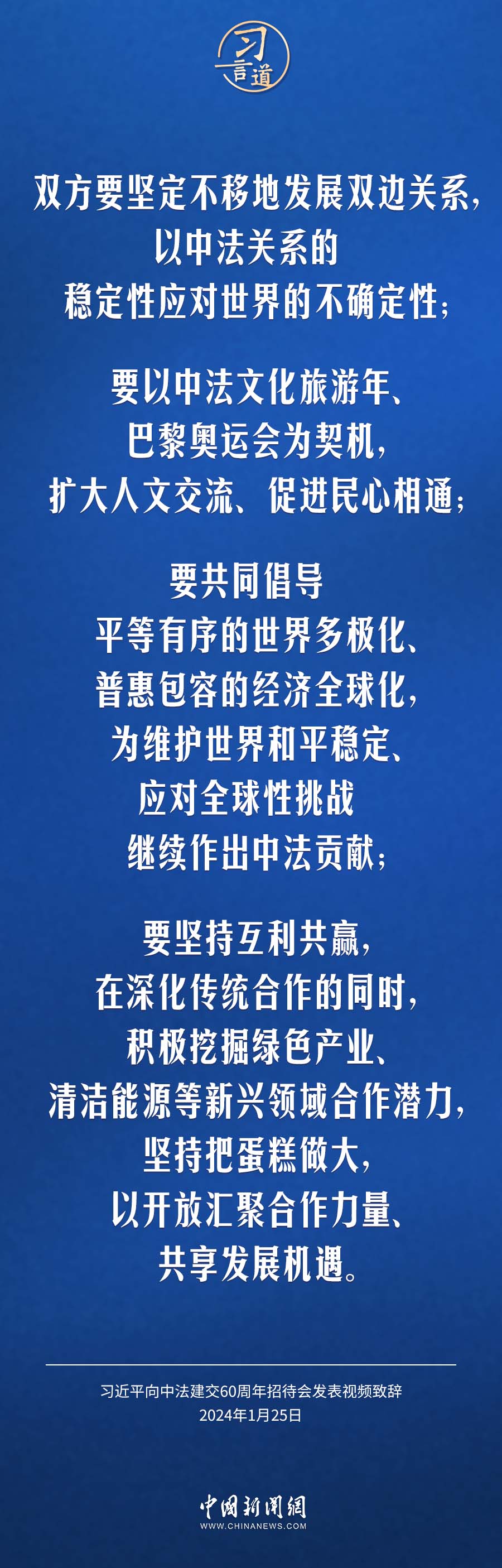 1月25日,中法建交60周年招待會在國家大劇院舉行,國家主席習近平發(fā)表視頻致辭。習近平指出——