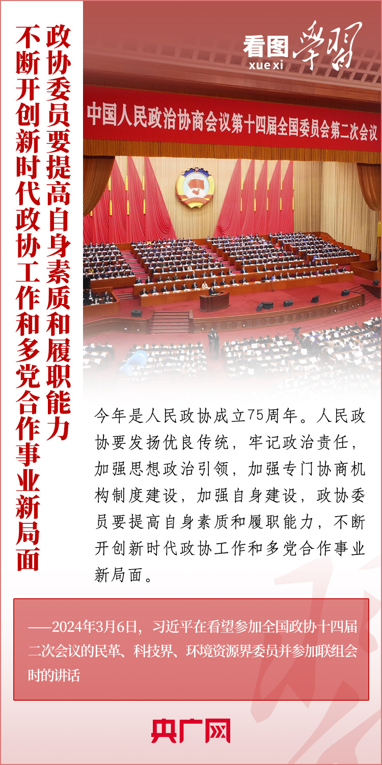 今年是人民政協(xié)成立75周年。3月6日下午,習(xí)近平總書記在看望參加全國(guó)政協(xié)十四屆二次會(huì)議的民革、科技界、環(huán)境資源界委員并參加聯(lián)組會(huì)時(shí)強(qiáng)調(diào),人民政協(xié)各黨派、各團(tuán)體、各族各界各方面人士要圍繞中共二十大提出的重大戰(zhàn)略任務(wù)和中央經(jīng)濟(jì)工作會(huì)議部署,深入調(diào)查研究,積極建言資政,廣泛凝聚共識(shí),助力中國(guó)式現(xiàn)代化建設(shè)。一起來學(xué)習(xí)!