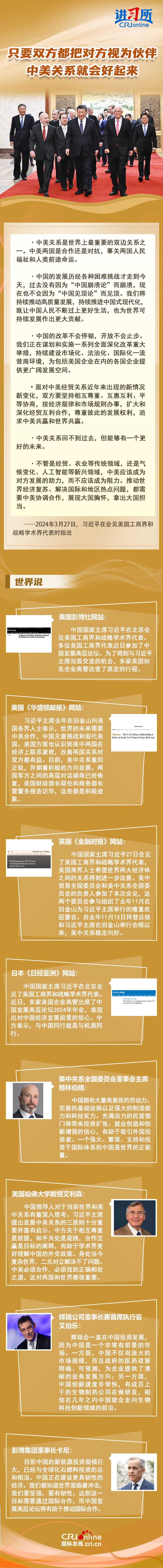 3月27日,中國(guó)國(guó)家主席習(xí)近平在北京會(huì)見美國(guó)工商界和戰(zhàn)略學(xué)術(shù)界代表時(shí)指出,中美各自的成功是彼此的機(jī)遇。只要雙方都把對(duì)方視為伙伴,相互尊重、和平共處、合作共贏,中美關(guān)系就會(huì)好起來。