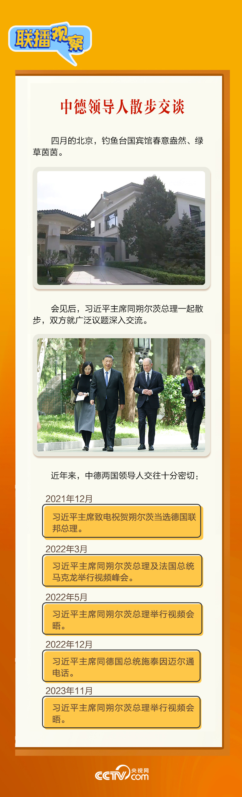 4月16日上午,習(xí)近平主席在北京釣魚臺(tái)國(guó)賓館會(huì)見朔爾茨總理。會(huì)見中,習(xí)主席強(qiáng)調(diào),要“牢牢把握中德是全方位戰(zhàn)略伙伴這一定位”。中德建立全方位戰(zhàn)略伙伴關(guān)系10年來(lái),兩國(guó)如何共同發(fā)展,相互成就?央視網(wǎng)《聯(lián)播觀察》帶您了解。