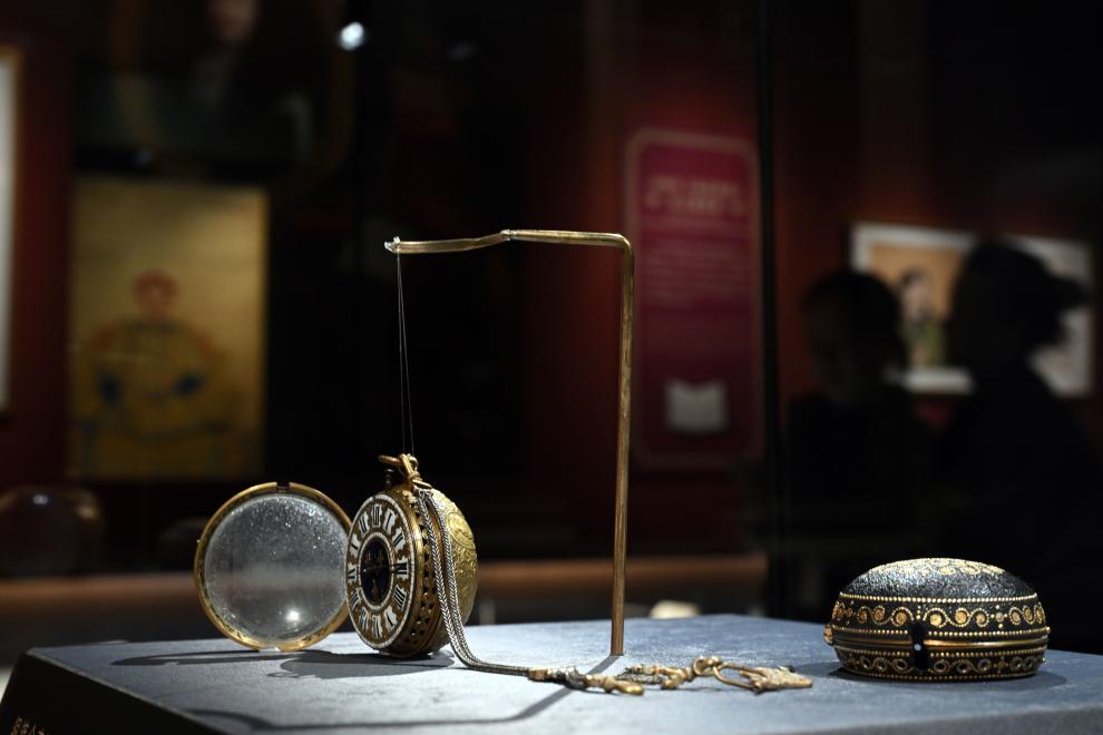 ??這是展出的故宮博物院藏銅鍍金殼開光人物像懷表。2024年4月1日,作為中法文化旅游年的重要項(xiàng)目,“紫禁城與凡爾賽宮——17、18世紀(jì)的中法交往”展覽開幕式在北京故宮文華殿舉行,展出大約200件文物精品。(新華社記者金良快攝)