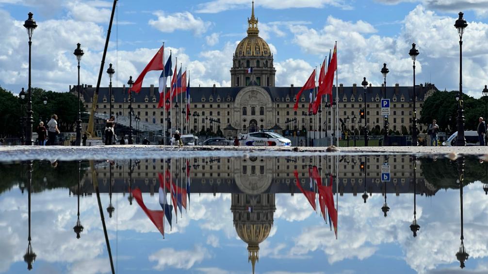 ??五月的巴黎,風(fēng)和景明。塞納河畔,榮軍院金色穹頂熠熠生輝,五星紅旗和藍(lán)白紅三色旗迎風(fēng)飄揚(yáng)。