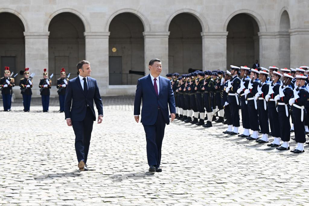 ??當(dāng)天下午,習(xí)近平在巴黎出席馬克龍舉行的隆重盛大歡迎儀式。兩國元首檢閱法蘭西共和國衛(wèi)隊(duì)和陸??杖妰x仗隊(duì),并觀看分列式。