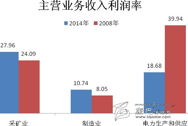 2013年,規(guī)模以上工業(yè)企業(yè)法人單位總資產貢獻率為8.46%,比2008年下降4.56個百分點。主營業(yè)務收入利潤率為18.83%,比2008年下降11.12個百分點。其中,采礦業(yè)為27.96%,比2008年上升3.87個百分點;制造業(yè)為10.74%,比2008年上升2.69個百分點;電力、熱力、燃氣及水生產和供應業(yè)為18.68%,比2008年下降21.26 個百分點(詳見表2-4)。