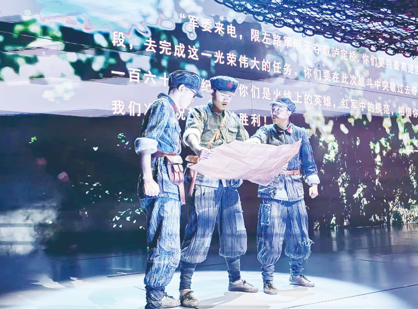 “同志們,跟我前進(jìn)!”“以最快速度趕到瀘定橋,才是我們的首要任務(wù)……”舞臺(tái)大幕開啟,影像結(jié)合舞美形成一組巨型浮雕,在燈光的映照下,紅軍戰(zhàn)士堅(jiān)毅的臉龐漸漸浮現(xiàn),他們佇立在瀘定橋旁,目光如炬。燈滅,炮火聲從遠(yuǎn)處傳來……這是大型原創(chuàng)舞臺(tái)劇《飛奪瀘定橋》中的場景,每天上午10時(shí)30分和下午3時(shí),該劇在瀘定縣紅軍飛奪瀘定橋紀(jì)念碑公園內(nèi)的紅軍劇場上演。偉大的長征是中國共產(chǎn)黨和紅軍譜寫的壯麗史詩,是中華民族偉大復(fù)興歷史進(jìn)程中的巍峨豐碑。舞臺(tái)劇《飛奪瀘定橋》聚焦宏大歷史中的典型事件,以紅軍長征途中飛奪瀘定橋戰(zhàn)役為背景,以一個(gè)紅軍小號手的視角,生動(dòng)講述紅四團(tuán)晝夜奔襲240里,22名突擊隊(duì)員在槍林彈雨中踩著13根鐵索成功奪下瀘定橋的故事,藝術(shù)展現(xiàn)紅軍的堅(jiān)定革命信念和必勝信心,讓觀眾在感動(dòng)中重溫偉大長征精神。