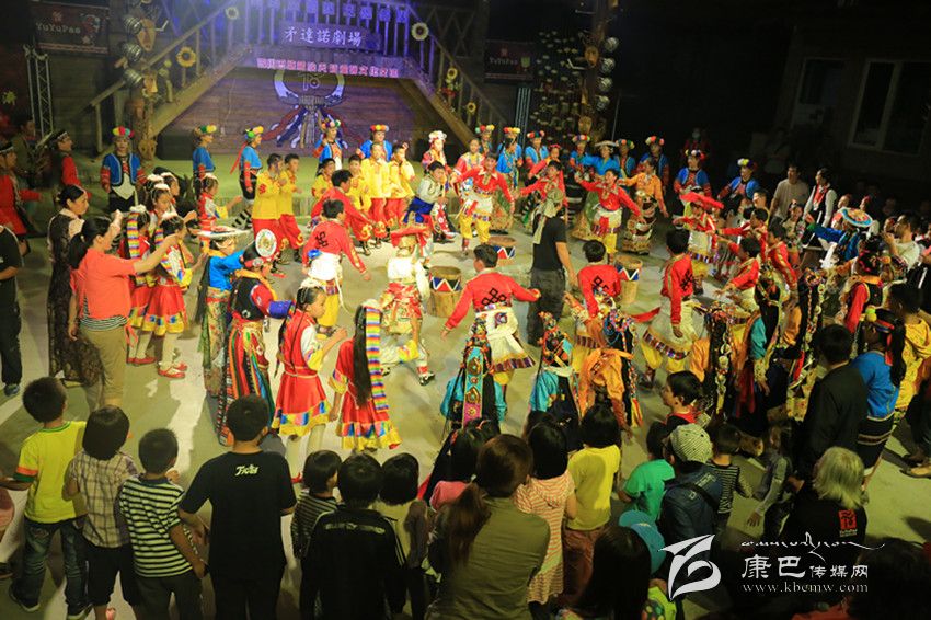 巴塘天籟童聲合唱團(tuán)與阿里山小學(xué)小朋友、當(dāng)?shù)厝罕?、外?lái)游客同跳巴塘弦子。