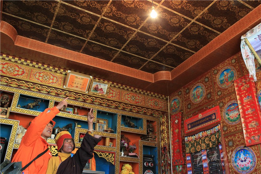 格吉大爺今年70歲了,他的孫子貢嘎是一名藏畫家,主要靠給鄉(xiāng)鄰的新房畫壁畫為生。他和哥哥兩人自學(xué)成才,鄉(xiāng)里很多人家屋內(nèi)那些精美絕倫的壁畫就出自他們兩兄弟之手。“以前電不好時(shí),天黑就無法工作,現(xiàn)在有電了,晚上都能畫,曾經(jīng)要畫1個(gè)多月的壁畫,現(xiàn)在20多天就能完成。如今電好了,電話信號也比以前強(qiáng),好多理塘縣城的朋友都打電話請我去給他們家里畫,這樣又能多掙些錢。”貢嘎的話語里透著對未來的幸福生活憧憬。